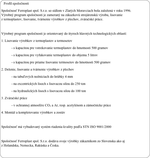 Spoločnosť Ferroplast spol. s.r.o. so sídlom v Zlatých Moravciach bola založená v roku 1996.